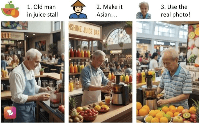 This is where the model really shines. You don’t have to settle for the first result. If something’s off, just tell Nano Banana what to tweak. In this interaction, I started by asking The Librarian to generate a picture of an old man working at a juice stall. But since we were in Singapore, I asked it to make the old man Asian, and again the model did not disappoint. Finally, I took a photo with my phone of the uncle sitting across from me and asked the AI to use that photo, and I was genuinely impressed with the outcome as the image looks so realistic!